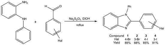 The target compounds were prepared in high yield via condensation of N-Phenyl-o-phenylenediamine with the corresponding halogen-substituted benzaldehyde in the presence of sodium metabisulfite (Scheme 1) [26,27].