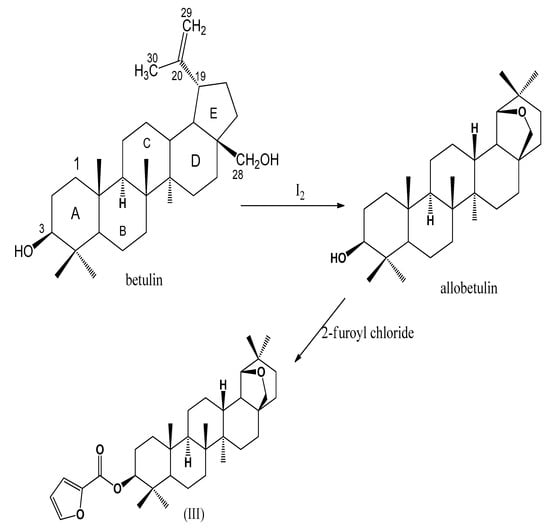 Betulin (lup-20(29)-ene-3β,28-diol), a pentacyclic triterpenoid, is an abundant, biologically active secondary metabolite that is found in birch species (Betula ssp.) [1]. The amount of betulin from different birch species ranges from more than 15% of dry weight in B. populifolia and B. payrifera to about 30% in B. verrucosa. Betulin is readily extracted from the bark of Betula ssp. and is an attractive starting material for making different derivatives, including betulinic acid. Betulinic acid and other betulin derivatives have been shown to exhibit multiple biological activities [2,3,4,5,6,7,8,9,10,11,12,13,14,15,16,17]. In addition to the selective oxidation of betulin to produce betulinic acid, other modifications have been carried out at C-3 and C-28 of betulin to make novel compounds for biological testing. Allobetulin (19β,28-Epoxy-18α-olean-3β-ol), (Scheme 1), is one of the compounds that is readily obtained from betulin. Acid-catalyzed rearrangement of betulin produces allobetulin in one step and in good yield, making it a valuable candidate for additional modifications. The ease with which betulin is converted to allobetulin has led to the syntheses of novel compounds that include esters, amines, and glycosides by transforming the 3-OH of allobetulin, along with novel modifications to ring A [18,19]. In our study, allobetulin was obtained from betulin by using hydrogen iodide as a catalyst for the transformation. The hydrogen iodide was generated in solution by the reaction of the primary alcohol on the substrate, betulin, with iodine. The synthesis of 19β,28-Epoxy-18α-olean-3β-ol-2-furoate was accomplished by reacting allobetulin with 2-furoyl chloride in dry dichloromethane.