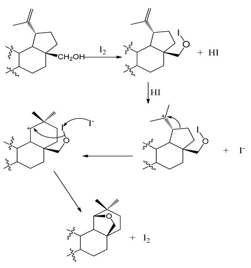 Allobetulin was synthesized from betulin by using hydrogen iodide (Scheme 1). The hydrogen iodide was generated in solution by reacting the C-28 hydroxy group of the substrate with iodine. The intermediate produced was R-O-I [Scheme 2]. Protonation of a double bond generated a tertiary carbocation that underwent the Wagner–Meerwein rearrangement.