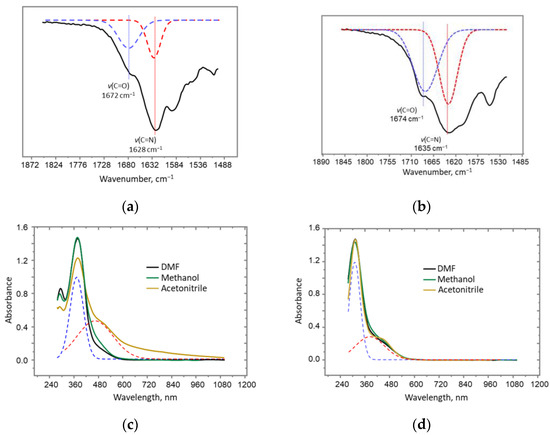 (a,b) Fragments IR spectra of (a) salRA and (b) dmaeRA; (c,d) UV spectra of (c) salRA and (d) dmaeRA in DMF, methane and acetonitrile (dotted line indicates bands for imine- (blue) and keto-groups (red)), C = 0.04 mM.