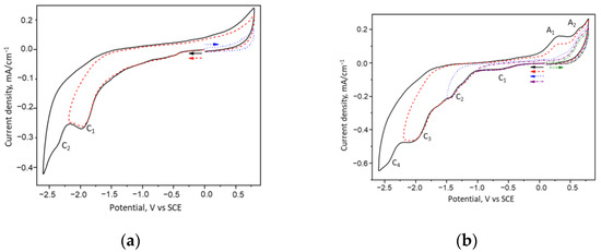 The cyclic voltammetry (CV) of dmaeRA reveals two reduction peaks (C1 and C2) at −1.34 V and −1.83 V, respectively, attributed to the reduction of imine- and keto-groups of enol-imine and keto-enamine tautomers (Figure 2a, Scheme 2). Both peaks were irreversible due to proton transfer from hydroxyl groups to nitrogen and oxygen atoms during the reduction.