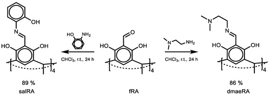 In this article we report on two new Schiff bases that are produced by reacting primary aromatic (o-aminophenol) and aliphatic (N,N-dimethyldiaminoethane) amines with the formyl derivative of resorcinarene (fRA, Scheme 1). The structure of the obtained compounds was investigated, and their tautomerism was evaluated by IR, NMR, and UV spectroscopy as well as cyclic voltammetry (CV).