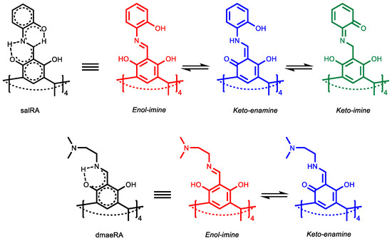 SalRA and dmaeRA exist in equilibrium in several tautomeric forms [20,21,22], the structures of which are presented in Scheme 2. The presence of vibration stretching bands of both C=N bonds (1628 cm−1 and 1635 cm−1 for salRA and dmaeRA, respectively) and C=O bonds (1672 cm−1 and 1674 cm−1 for salRA and dmaeRA, respectively) in IR spectra in potassium bromide pellets indicates the formation of both imine- and keto-isomers (Figure 1a,b and Figures S3 and S4 in SM) [23].
