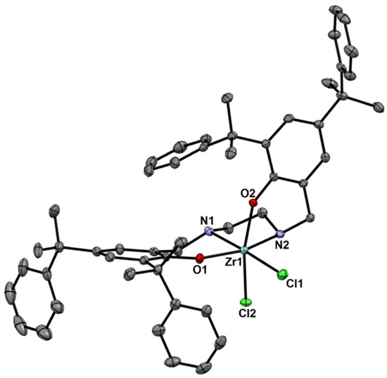 Crystals of 2 suitable for single-crystal X-ray diffraction were obtained from a diethyl ether solution at −20 °C. Compound 2 crystallized with one diethyl ether molecule in the asymmetric unit. Crystal data for 2 (C4H10O) (M = 979.24 g/mol): monoclinic, space group P21/n (no. 14), a = 15.475(2) Å, b = 11.729(1) Å, c = 28.533(3) Å, β = 93.430(4)°, V = 5169.6(10) Å3, Z = 4, T = 150(2) K, μ(MoKα) = 0.360 mm−1, Dcalc = 1.258 g/cm3, 54,545 reflections measured (3.075° ≤ Θ ≤ 27.914°), 12,300 unique (Rint = 0.0878, Rsigma = 0.0781) were used in all calculations. The final R1 was 0.0736 (I > 2σ(I)) and wR2 was 0.1161 (all data). The ORTEP diagram of the solid-state molecular structure of 2 is shown in Figure 1. Complex 2 displays distorted octahedral geometry around the zirconium center with the salan ligand adopting a β-Λ-cis conformation [25]. The equatorial plane is defined by the Cl(1) atom and the N(1), N(2) and O(1) atoms of the salan ligand, and the axial positions of the octahedron are occupied by the Cl(2) atom and the O(2) atom of the salan ligand. The overall bond distances and angles determined for 2 are within the ranges reported for other zirconium(IV) complexes supported by salan ligands described in the literature [26,27,28,29]. The solid-state molecular structure of 2 is similar to the one of the salan titanium(IV) complex [(H2N2O2)TiCl2] already reported [6].