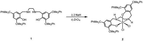 The treatment of ZrCl4 with the sodium salt H2N2O2Na2 prepared in situ by the reaction of two equiv. of NaH with H2N2O2H2, 1 [6], afforded the complex [(H2N2O2)ZrCl2], 2, (H2N2O2H2 = HOPh’CH2NH(CH2)2NHCH2Ph’OH, where Ph’ = 2,4-(CMe2Ph)C6H2), as shown in Scheme 1.