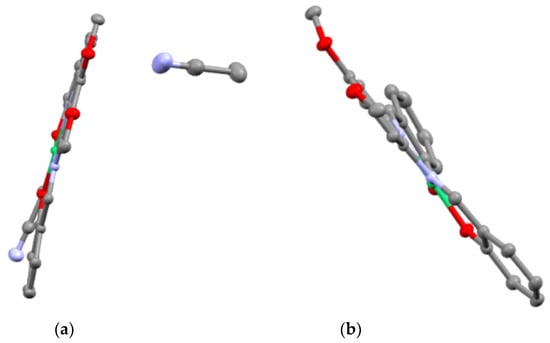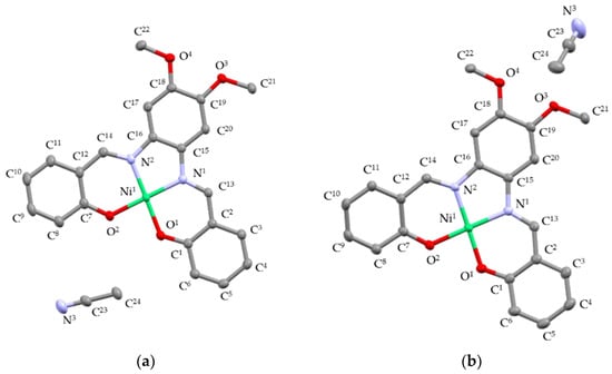 Molecular view of [Ni(Salphen(CH3O)2)]·CH3CN in representation of atoms with thermal ellipsoids (p = 50%), structures (a,b).