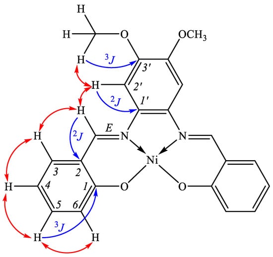 Analysis of the 1H-1H NOESY spectrum (mixing time variation) indicates the planar structure of the complex. Thus, the cross-peaks H2′/CH=N, CH=N/H3, due to the nuclear Overhauser effect, indicate the spatial proximity of the azomethine proton simultaneously with two protons of different aromatic rings, which is possible with the coplanar organization of the (E)-azomethine block.