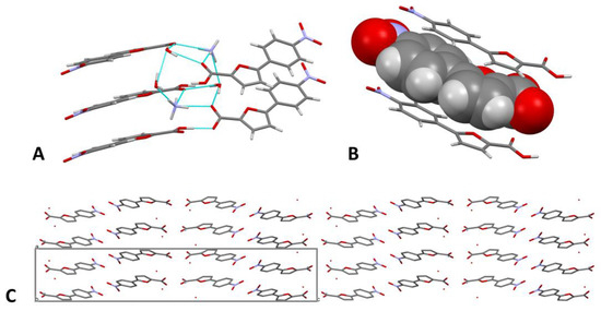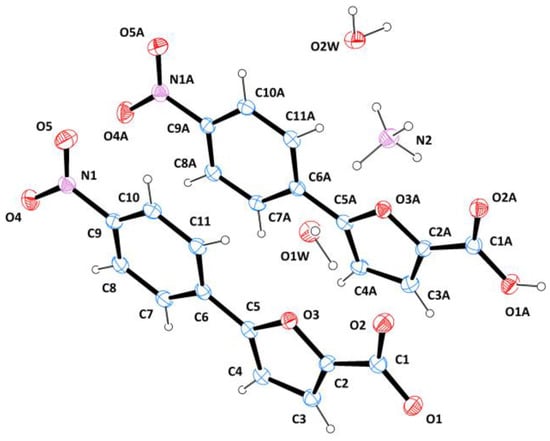 Over the years, we optimized the scaffold of our furan-based compounds, identifying promising candidates active on mycobacterial models [20,21,22,23]. A key part of our investigations was the structural study of protein-ligand complexes, which led to the definition of the main interactions established by our compounds in the active site of the enzyme. During one of our data acquisition sessions at the European Synchrotron Radiation Facility (ESRF) in Grenoble (France), we ran across an unexpected diffraction pattern, which was incompatible with that of a protein or a simple inorganic salt. The analysis of the structure later revealed the crystal to be the organic ligand, namely 5-(4-nitrophenyl)furan-2-carboxylic acid (1). Despite being accidental and unsought, the obtainment of this structure was deemed a valuable result, especially considering that 5-phenyl-furan-2-carboxylic acids are intrinsically impervious to crystallization. This feature, which is confirmed by the absence of reported crystal structures for these compounds, is probably due to their limited solubility in organic and aqueous solvents, which results in their rapid precipitation and prevents the organization of the molecules in an ordered fashion to form a crystal lattice. Our previous results suggested that this issue could be partially overcome by derivatizing the compounds to form methyl esters. However, this strategy prevented the study of the molecules in their original form, essentially depriving them of the characteristic acidic function, which imparts unique features in terms of available hydrogen-bonding sites. Therefore, this apparently trivial crystal structure proved to be very important for the study of the intermolecular forces and interactions of this class of compounds.