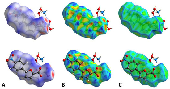 (A). HS mapped over dnorm with a fixed color scale in the range −0.8453 au (red)—1.2461 au (blue) for the main molecule (above) and −0.8481 au (red)—1.2111 au (blue) for molecule A (below), based on the length of the intermolecular contacts with respect to the sum of the van der Waals radii (red: shorter; blue: longer; white: same). (B). HS mapped over the shape-index (color scale: −0.9957 au—0.9994 au for the main molecule; −0.9882 au—0.9924 au for molecule A). Blue areas indicate bumps, while red regions represent hollows. (C). HS mapped over the curvedness (color scale: −4.0490 au—0.4420 au for the main molecule; −3.8574 au—0.3755 au for molecule A). Flat regions are colored green, while edges are blue.