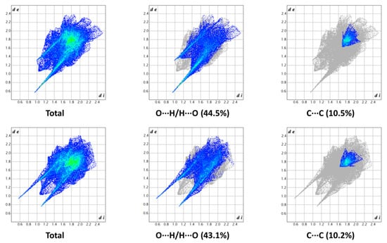 The two-dimensional (2D) fingerprints of the two HSs, providing a visual summary of the contribution of each contact type and the relative area of the surface corresponding to it, revealed the importance of the many short-range O···H/H···O contacts, represented by the long spikes protruding towards the lower left part of the graph. The presence of C···C contacts, indicating the π-π stacking of the aromatic rings, was confirmed by the characteristic arrow-shaped region at the center of the plot. The high density of green spots at 1.8–1.9 Å de/di confirmed the high contribution of these points on the HS. The remaining significant portions of the surface were attributed to unspecific van der Waals contacts (H···H and C···H/H···C). The main fingerprint plots related to the two HSs are reported in Figure 4. The enrichment ratios, calculated according to Jelsch et al. [28], showed that O···H/H···O and C···C contacts were enriched (Exy > 1), further substantiating the previous observations.