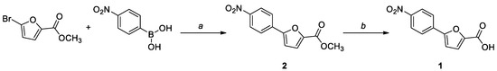 Compound 1 was prepared by an established procedure, involving a Suzuki coupling between methyl 5-bromofuran-2-carboxylate and (4-nitrophenyl)boronic acid, followed by a hydrolysis of the ester moiety in basic conditions (Scheme 1). The intermediate was characterized by 1H NMR and 13C NMR, while for the final compound, the HRMS spectrum was also acquired. The analytical data were consistent with the literature.