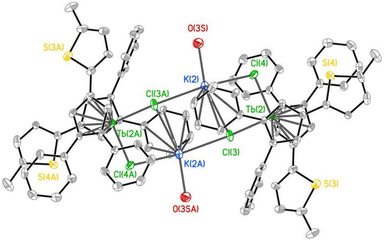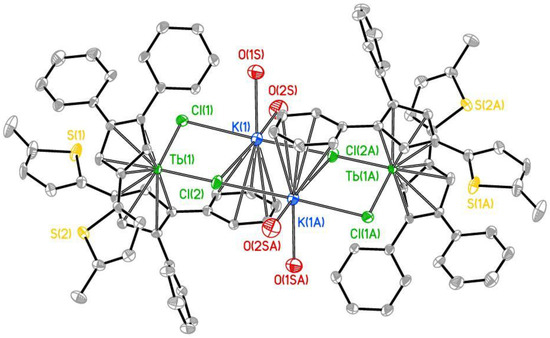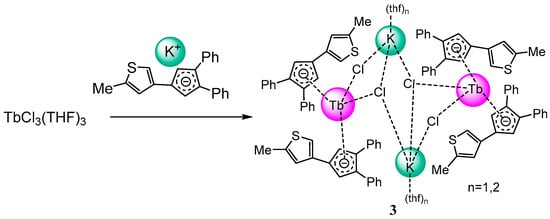 The reaction of TbCl3(thf)3 with two equivalents of (3,4-diphenyl)(2-methylthienyl)cyclopentadienylpotassium (CpThK), obtained in situ from 2-(3,4-diphenylcyclopenta-1,3-dien-1-yl)-5-methylthiophene and benzylpotassium, gave the bis(cyclopentadienyl) binuclear terbium complex [(Cpth)2Tb2(µ2-Cl)(µ3-Cl)K(thf)1.5]2 (3), where CpTh = (2-methylthienyl)-3,4-Ph2C5H2). (Scheme 2).