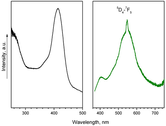 The bis-triphenylcyclopentadienyl terbium complex [(CpPh3)2Tb(µ2-Cl)(µ3-Cl)K]2 exhibits relatively strong luminescence (quantum yield of photoluminescence is 25% [11]). However, the introduction of a thienyl substituent instead of one phenyl ring changes dramatically the efficiency of luminescence sensitization of the Tb3+ ion (Figure 3). In the excitation spectrum two intense bands centered at 270 and 410 nm are observed and tentatively assigned to the Cp ring and to the intraligand charge transfer (ILCT) state, respectively [11,12]. It should be noted that this charge transfer state can be caused by both the presence of the thienyl ring and K+-π interaction with the phenyl ring. Replacement of the phenyl ring by the thienyl ring usually leads to decreasing the energy of the triplet state of the ligand [14]. Taking into account that the energy of the triplet state in the biscyclopentadienyl complex with triphenyl-substituted Cp was found to be 435 nm, it is logical to expect a back energy transfer (BET) process leading to luminescence quenching in complex 3. As a result, the luminescence spectrum exhibits only one weak line assigned to 5D4-7F5 transition of the Tb3+ ion as well as a broad band of the ligand.