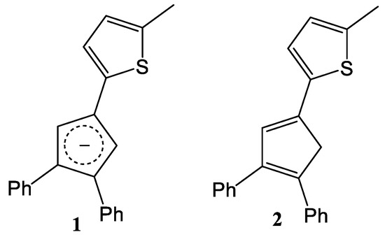 Structures of the new cyclopentadienyl ligand (3,4-diphenyl)(2-methylthienyl)cyclopentadienyl–anion (1) and the corresponding cyclopentadiene 2-(3,4-diphenylcyclopenta-1,3-dien-1-yl)-5-methylthiophene (2).