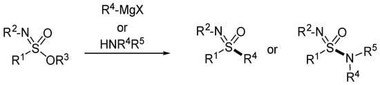 - Jonsson, E.U.; Johnson, C.R. Chemistry of Sulfoxides and Related Compounds. XXXIII. Stereochemistry of Substitution at Tetracoordinate Hexavalent Sulfur. Nucleophilic Reactions at Sulfur in Sulfonimidoyl Compounds. J. Am. Chem. Soc. 1971, 93, 5308–5309. [Google Scholar] [CrossRef]