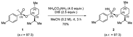 A solution of (1R,2S,5R)-2-isopropyl-5-methylcyclohexyl (S)-4-methylbenzenesulfinate (0.2 M in MeCN) was treated with 4.0 equivalents of ammonium carbamate and 2.5 equivalents of diacetoxyiodobenzene, and the mixture was stirred for 3 h at room temperature (Scheme 2). The 1H NMR analysis of the crude evidenced the total consumption of the starting sulfinate and the formation of the desired product as a single diastereoisomer. The formation of sulfonimidate 2 was first assumed by the appearance of a broad proton signal at 3.14 ppm which was assigned to the NH group (CDCl3). The product was obtained in 70% yield (e.r. = 97:3) after column chromatography on neutral alumina. The HRMS analysis confirmed the empirical formula for sulfonimidate 2. To assign the enantiomeric ratio of sulfonimidate 2, the starting menthyl sulfinate (±)-1 was synthesized from racemic menthol, obtaining a 1:1 mixture of diastereoisomer to sulfur, which was subsequently transformed under the reported conditions into racemic sulfonimidate (±)-2. The HPLC analysis at the chiral stationary phase of the product revealed the expected four peaks for the four steroisomers used as the reference against the optically active compound 2 (see Supplementary Materials). Although the X-ray analysis could not be performed because of the waxy nature of sulfonimidate 2, the imidation step was performed stereoselectively towards (1R,2S,5R)-2-isopropyl-5-methylcyclohexyl (R)-4-methylbenzenesulfonimidate according to precedent results observed in the imidation of chiral optically active sulfoxides [,].
