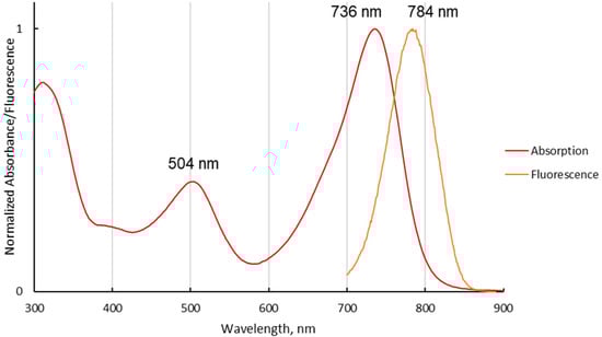 The investigation of the spectral properties (Figure 1) showed that the aminophenyl-substituted aza-BODIPY exhibits absorption and fluorescence in the near-IR region of the spectrum, the so-called “first biological window”, making it suitable for application in biological liquids and tissues.