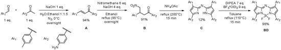 The common synthesis of aza-BODIPY includes four stages (Scheme 1) [12]. However, the conditions of every step dramatically impact the target substituents in the aza-BODIPY core. In this work, it was found that an inert atmosphere and a low temperature are essential for obtaining pure chalcone A in high yields. The use of NaOH as a base allowed us to simplify the separation of target Michael adduct B as a residue from a water solution. The obtention of aza-DPM C was carried out without solvent, causing the process to last 15 min instead of several hours. The final complexation in toluene allowed us to heat the reaction mixture up to 110 °C and reduce reaction time to 15 min.