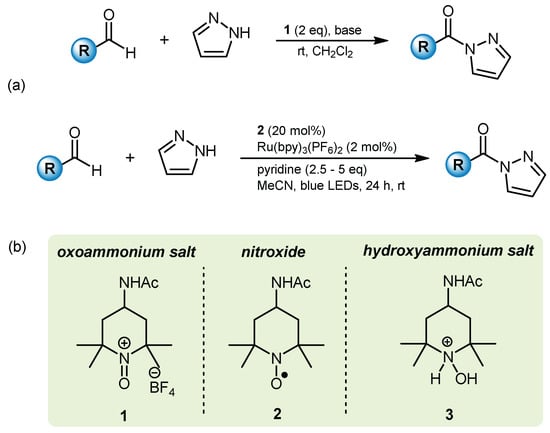 (a) Oxidative amidation of aldehydes with pyrazole to prepare acyl pyrazoles. (b) Oxoammonium salt 1, and its nitroxide and hydroxylammonium analogs 2, and 3.