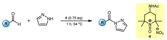 Oxidative amidation of aldehydes with pyrazole to prepare acyl pyrazoles using a substoichiometric quantity of oxoammonium salt 4.