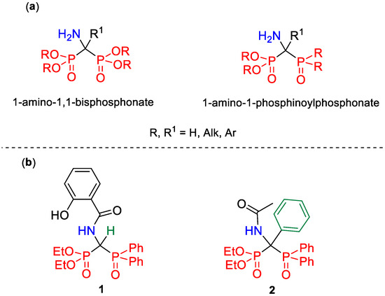The 1,1-Bisphosphorus derivatives are gaining more and more importance, and hence, the chemists’ interest due to their high biological activity. This feature is conditioned by the presence of the P-C-P skeleton, which is not only resistant to enzymatic hydrolysis but also provides them with an affinity for hydroxyapatite that occurs in bones [1]. One of the best-known groups of 1,1-bisphosphorus compounds are 1-amino-1,1-bisphosphonates, which can be considered phosphorus analogs of α-amino acids that are functionalized with an additional phosphonyl group [2]. These compounds are an important class of drugs currently used to treat osteoporosis and other diseases of similar etiology, such as Paget’s disease, hypercalcemia, or bone metastasis [3,4]. Their medical importance results also from other biological properties, including antibacterial, antiviral, and antiparasitic [5,6,7], as well as from their potential use as drug delivery systems to bone tissue in targeted anti-cancer therapies [8] or the possibility of the utilization in the synthesis of new diagnostic agents for imaging of bone tissue by MRI or PET [9].