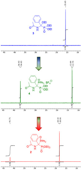 The progress of the entire transformation can be monitored by NMR spectroscopy, especially 31P NMR (Figure 2), and the structure of the obtained compound was confirmed by spectroscopic methods (1H, 13C, 31P NMR, MS, and IR; see also Supplementary Materials). During the conversion of diethyl 1-(N-acetylamino)-1-ethoxy-1-phenylmethylphosphonate 3 into diethyl 1-(N-acetylamino)-1-triphenylphosphonio-1-phenylmethylphosphonate tetrafluoroborate 4, in the 31P NMR spectrum, the disappearance of the singlet at 15.7 ppm and the appearance of two doublets at 36.9 and 12.8 ppm with the same coupling constant (J = 16.2 Hz) was observed. In turn, when the phosphonium salt 4 was treated with methyl diphenylphosphinite, the 31P NMR spectrum revealed the disappearance of these two mentioned above doublets and the appearance of a new doublet at 18.1 ppm (J = 6.5 Hz) and a broadened singlet at 41.7 ppm corresponding to the expected product of the Michaelis–Arbuzov reaction.