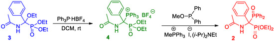 In the first step, diethyl 1-(N-acetylamino)-1-triphenylphosphonio-1-phenylmethylphosphonate tetrafluoroborate 4 was synthesized by mixing diethyl 1-(N-acetylamino)-1-ethoxy-1-phenylmethylphosphonate with triphenylphosphonium tetrafluoroborate in a dichloromethane solution at room temperature for 1 h. The crude phosphonium salt, obtained after evaporation of the volatiles from the reaction mixture, was then crystallized by dissolving it in dichloromethane and precipitating with diethyl ether. After this purification process, the expected phosphonium salt 4 was provided with a purity of 96%. It was further used in the next step consisting in the Michaelis–Arbuzov-like reaction with methyl diphenylphosphinite in a double catalytic system in the presence of methyltriphenylphosphonium iodide and Hünig’s base. The reaction proceeds efficiently at room temperature in dichloromethane, so the reaction mixture was left overnight to complete it. Then, the residue obtained after evaporation of the solvent from the reaction mixture was subjected to extraction with toluene to isolate the product 2. It turned out that the purity of the resulting extract was quite enough to omit the known procedure of further purification by column chromatography, and thus only recrystallization of the crude product was performed. According to this procedure, the pure product was furnished with a yield of 97% (the melting point of the crystalline compound was 125–127 °C).