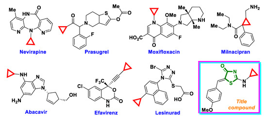 - Sun, M.R.; Li, H.L.; Ba, M.Y.; Cheng, W.; Zhu, H.L.; Duan, Y.T. Cyclopropyl Scaffold: A Generalist for Marketed Drugs. Mini-Rev. Med. Chem. 2021, 21, 150–170. [Google Scholar] [CrossRef]