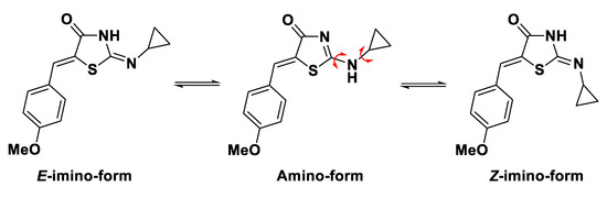 - Enchev, V.; Markova, N.; Angelov, S. Ab initio study of 2,4-substituted azolidines. II. Amino-imino tautomerism of 2-aminothiazolidine-4-one and 4-aminothiazolidine-2-one in water solution. J. Phys. Chem. A 2005, 109, 8904–8913. [Google Scholar] [CrossRef]
