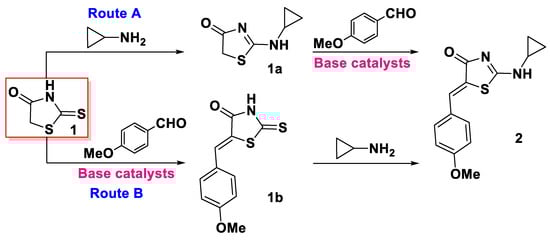Two possible pathways could be proposed using the retrosynthetic approach for synthesis of title 2-(cyclopropylamino)-5-(4-methoxybenzylidene)thiazol-4(5H)-one (2) (routes A and B, Scheme 1) via two-stage protocols. However, these schemes need the application of base catalysts at least in one of the stages, and additional difficulties could be met with the separation and purification of product 1a.