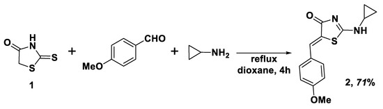 That is why we developed a convenient step-economy and cost-effective multicomponent protocol for the synthesis of title compound 2. The proposed approach is based on direct one-pot interaction of 2-thioxothiazolidin-4-one (rhodanine) (1), 4-methoxybenzaldehyde (both reagents used in the equimolar amounts) with cyclopropylamine which was used in 10% excess compared to 1 and to aromatic aldehyde (Scheme 2). Application of cyclopropylamine excess allows for avoiding the additional use of base catalysts. The mixture of the above-mentioned reagents was refluxed for 4 h in the dry dioxane medium, and after cooling to room temperature, the target derivative 2 was obtained with a yield 71%. Synthesized in such a way, compound 2 possesses a good level of purity; however, it could be recrystallized from glacial acetic acid.