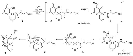 The plausible mechanism of the considered photoprocess is depicted in Scheme 2. At first, based on the literature data, we suppose the excited state intramolecular proton transfer (ESIPT) in the pyranone fragment [21,22,23]. Under the UV light, the starting compound 2, via rapid proton transfer in the excited state A*, transforms into the photoisomer B*. Next, the relaxation of B* leads to zwitterion C, followed by the transformation of the unstable compound C to bicyclic oxirane D and opening to α-hydroxy-1,2-diketone E. Finally, intramolecular cyclization of the amide group in the side chain and carbonyl moiety of cyclopentene-1,2-dione fragment results in the target 4a,7a-dihydroxy-1-(2-hydroxyethyl)-5-methyl-2′,3′,4a,5′,6′,7a-hexahydrospiro[cyclopenta[b]pyridine-4,4′-pyran]-2,7(1H,3H)-dione 1.
