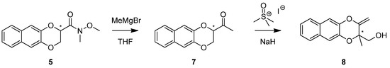 We decided to further confirm our hypothetical reaction mechanism by conducting the reaction with a different starting material, the corresponding methyl ketone 7. The methyl ketone 7 is characterized by the presence of an additional methyl group and could be easily achieved by treating Weinreb amide 5 with methylmagnesium bromide, as previously performed for the benzodioxane derivative [9] (Figure 2). Following our idea, the resulting derivative should be lacking the double of doublets at 4.56 ppm while showing a simplified system at the 3.60–3.96 ppm range and an additional methyl singlet around 1.6 ppm.