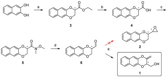 For the obtainment of compound 2, following what was previously performed on the benzodioxane derivatives [9], we designed and applied a straightforward synthetic pathway starting from naphtalen-2,3-diol, where the last step was the Corey–Chaykovsky epoxidation of the corresponding aldehyde (Scheme 1). In the present work, we report the completely unexpected evolution of the Corey–Chaykovsky reaction, leading to an unsaturated alcoholic derivative 1 with good yields and as the main outcome of the reaction. The unknown compound was exhaustively characterized, and the reaction mechanism responsible for its formation was first hypothesized and later confirmed.