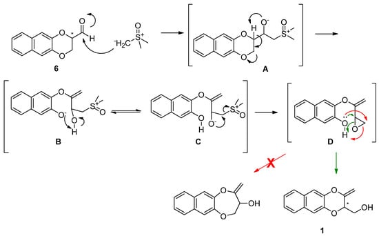 As shown in Scheme 2, our proposed mechanism involves the initial nucleophilic attack of the ylide to the carbonyl, as also expected for the correct evolution of the Corey–Chaykovsky reaction. Nonetheless, in this case, the so formed alcoholate (A) does not proceed through the elimination of the sulfonium cation, giving the desired product. Instead, the presence of the two oxygens of the naphthodioxane ring should be responsible for the first deprotonation of the carbon in position 2-, the consequent formation of the unsaturation, the opening of the 1,4-dioxane ring, and the final formation of the phenate function (B).