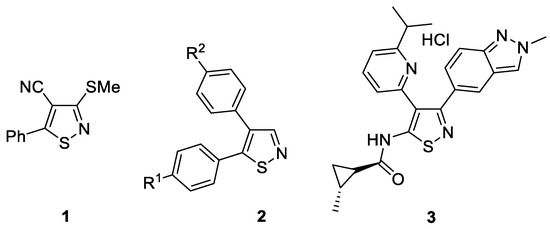 Isothiazoles are useful compounds owing to their wide biological activity, industrial applications, and their use as synthetic intermediates [1]. In particular, aryl- and hetaryl-substituted isothiazoles show rich biological activity, i.e., 5-phenylisothiazole 1 showed antiviral activity against polio [2], 4,5-diarylisothiazoles 2 were active as multiple target non-steroidal anti-inflammatory agents [3] and 4-pyridylisothiazole 3 is a possible HIV inhibitor [4] (Figure 1).