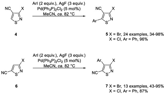- Ioannidou, H.A.; Koutentis, P.A. Silver-mediated palladium-catalyzed direct C-H arylation of 3-bromoisothiazole-4-carbonitrile. Org. Lett. 2011, 13, 1510–1513. [Google Scholar] [CrossRef] [PubMed]