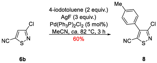 The reaction of 3-chloroisothiazole-5-carbonitrile (6b) with 1-iodo-4-methylbenzene (2 equiv.), in the presence of AgF (3 equiv.), Pd(Ph3P)2Cl2 (5 mol%) and Ph3P (10 mol%), in MeCN at ca. 82 °C led to a complete consumption of the starting isothiazole and isolation of the desired 3-chloro-4-(p-tolyl)isothiazole-5-carbonitrile (8) in a 60% yield (Scheme 2), while no other products were observed by TLC.