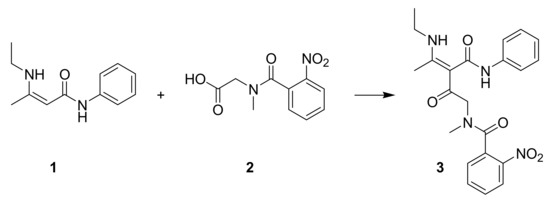 Synthesis of N-(4-Ethylamino-2-oxo-3-phenylcarbamoyl-pent-3-enyl)-N-methyl-2-nitro-benzamide (3): N-methylmorpholine (3 mmol, 0.33 mL) was added to a magnetically stirred suspension of o-nitrobenzoylsarcosine 2 (715 mg, 3 mmol) in CH2Cl2 (15 mL). The resulting solution was then cooled in an ice bath, and ethyl chloroformate (3 mmol, 0.3 mL) was added dropwise. The mixture was left to stir for 5 min, and after that, a solution of enamino amide 1 (613 mg, 3 mmol) and DMAP (73 mg, 0.6 mmol) in CH2Cl2 (45 mL) was added in one go. The ice bath was then removed, the reaction mixture was allowed to warp up to r.t. and was left to stir for one more hour. The reaction mixture was then transferred to a separatory funnel with 20 more mL of CH2Cl2 and washed with aqueous (10:1) HCl. The aqueous layer was extracted with 20 more mL of CH2Cl2, the combined organic layers were dried with anhydrous sodium sulfate, the drying agent was removed by filtration, and the solvent was distilled off. The crude α-C-acylated product 3 crystallized upon trituration with diethyl ether. Yield: 1.08 g (85%), yellow solid, m.p. 151–153 °C. 1H-NMR (DMSO-d6, δ ppm, J Hz): 1.21 (t, J = 7.0, 3H), 2.02/2.08 (s, 3H), 2.80/2.95 (s, 3H), 3.41 (m, 2H), 4.02/4.39 (s, 2H), 7.01–8.20 (m, 9H, Aryl), 10.05/10.27 (s, 1H, NH), 11.44/11.53 (t, J = 5.6, 1H, NH); 13C-NMR (DMSO-d6, δ ppm): 15.4/15.6 (CH2CH3), 16.5/16.7 (=CCH3), 33.9/37.9 (NCH3), 38.1/38.2 (NHCH2CH3), 53.0/56.2 (COCH2N), 106.9/107.0 (C), 119.6, 123.8, 125.1, 128.4, 128.8, 129.1, 129.2, 130.7, 132.8, 133.2, 134.9, 135.3, 139.7, 140.0, 145.5, 145.9 (Aryl C, CH), 164.3/165.0 (CO), 167.4 (C=C-CO) 167.6/167.9 (CO), 186.8/187.4 (CO). Some signals are doubled because of rotamers. IR (KBr, cm−1): 3283, 3060, 3037, 2977, 2936, 2877, 1637, 1595, 1578, 1529, 1347. HRMS m/z (ES+): calcd. for C22H24N4NaO5+ [M + Na]+ 447.1639, found 447.1636.