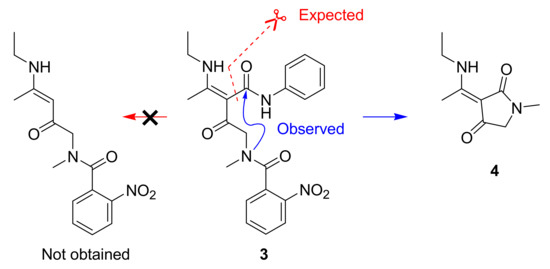 Compound 3 was expected to undergo a decarbamoylative C-C bond cleavage [16] in the next step of our planned synthesis—a reactivity observed by us in other derivatives of this type possessing a tertiary nitrogen in their amino acid moiety (Scheme 2). Here, however, the o-nitrobenzoyl group proved unstable under the reaction conditions (H3PO4 at 60 °C), and compound 3 underwent a cyclisation to the tetramic derivative 4 as a single product—a reactivity common for analogous compounds with secondary nitrogen in the amino acid residue [15]. Compound 4 was isolated in an 82% yield after column chromatography. Although unexpected, this result indicates a possible extension of our previously published procedure, giving access to enaminotetramic derivatives with methyl, rather than an alkoxycarbonyl substituent, at the N-atom of the tetramic ring.