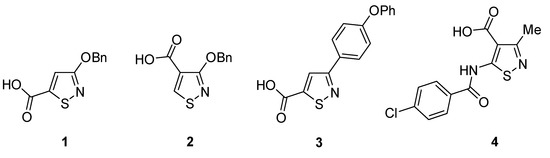 Isothiazoles are useful compounds owing to their wide biological activity, industrial applications, and their use as synthetic intermediates [1,2]. An example of a biologically useful isothiazole is the antibacterial drug sulfasomizole, while other isothiazoles have been studied as anticancer agents [3], or showed acaricidal, insecticidal, and fungicidal activity [4,5]. Carboxylic acid substituted isothiazoles in particular have shown useful biological activity, such as the anti-HIV activity of 3-benzyloxyisothiazole-4/5-carboxylic acids 1 and 2 [6], hypolipidemic activity of phenoxy derivative 3 [7], and anti-inflammatory activity of carboxamide 4 [8] (Figure 1).