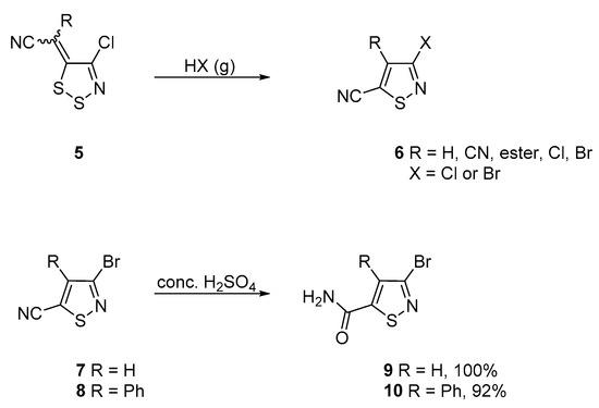 Our interest in isothiazoles focuses on their formation from 1,2,3-dithiazole precursors 5 by treatment with gaseous HCl or HBr [9] (Scheme 1). We later investigated the CH arylation of both the 5 [10] and the 4 [11] positions to obtain arylisothiazole products. Since both of these investigations involved mainly cyano-substituted isothiazoles, we looked at the possibility of functional group modifications by performing their hydration reaction in the presence of conc. H2SO4. Carboxamide products 9 and 10 were isolated in high yields [11] (Scheme 1).