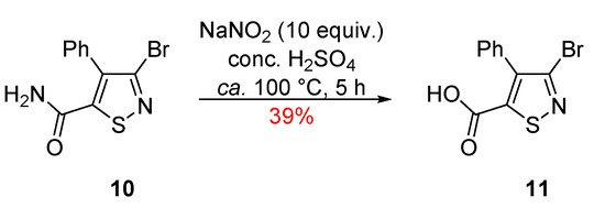 We started our investigation from 4-phenylisothiazole 10 by applying conditions used in the literature for a similar scaffold [12]. The reaction of 3-bromo-4-phenylisothiazole-5-carboxamide 10 with NaNO2 (10 equiv.), in conc. H2SO4, at ca. 100 °C led to a complete consumption of the starting isothiazole and isolation of the desired compound 11 in 39% yield (Scheme 2), while no other products were observed by TLC.