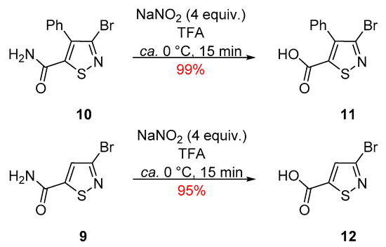 In an attempt to improve the yield of carboxylic acid 11, we investigated a milder set of conditions that avoided the use of conc. H2SO4 as the solvent and required fewer equivalents of NaNO2 and a lower temperature [13]. The reaction of 4-phenylisothiazole 10 with NaNO2 (4 equiv.), in TFA, at ca. 0 °C led to a fast consumption of the starting isothiazole and isolation of the desired compound 11 in an excellent 99% yield (Scheme 3). The same reaction conditions were also applied to the reaction of 3-bromoisothiazole-5-carboxamide (9), which gave the desired carboxylic acid 12 in an excellent 95% yield (Scheme 3). Compound 12 has a PubChem number and is commercially available but no synthesis or data are reported on it.
