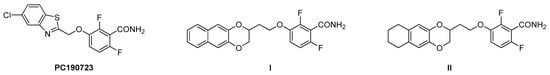 Recently, our research group reported a novel class of 1,4-naphthodioxane- or 1,4-tetrahydronaphthodioxane-benzamides as strong antimicrobials [], acting through the inhibition of FtsZ, which resulted to be more potent than other benzamides previously reported [,,,,]. In particular, I and II (Figure 1) possess MIC values of 0.25 μg/mL and 0.1 μg/mL versus both Methicillin-sensitive and Methicillin-resistant S. Aureus, respectively. Moreover, I and II are both active vs. B. subtilis with MICs under 0.1 μg/mL [].