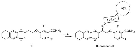 After having proved their capability to interact and inhibit both S. aureus and B. subtilis FtsZ, the need of having a fluorescent analogue (Figure 2) of compound II, the strongest one, arose. An appropriate probe could indeed help to elucidate FtsZ inhibitors’ mechanism of action, as well as to understand any possible off-target interaction, to screen for novel antibiotics, to track antibiotic uptake throughout cells and organisms, and also to detect bacterial infections. Nonetheless, despite the clear and broad utility, the number of fluorescent FZ-probes so far available [,] is, to the best of our knowledge, now limited to only a couple of examples.