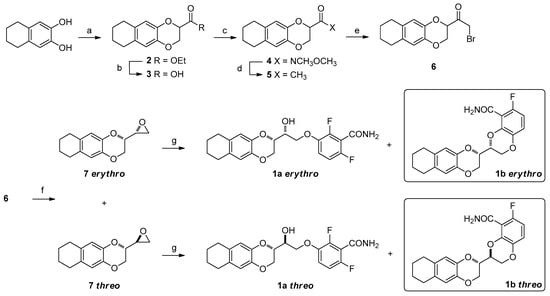 This substituent generates a second stereocenter, and the consequent formation of both erythro and threo isomers. The obtainment of 1a, for which we followed Scheme 1, involves the final ring opening of isolated erythro and threo epoxides. In the present work, we report how both these ring openings could surprisingly allow the achievement, in significant quantities, of the bicyclic side products 1b, the 6-fluoro-3-(2,3,6,7,8,9-hexahydronaphtho[2,3-b][1,4]dioxin-2-yl)-2,3-dihydrobenzo[b][1,4]dioxine-5-carboxamides.