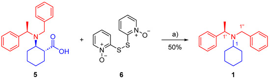 The synthesis of (R)-N-benzyl-N-(1-phenylethyl)cyclohexanamine 1 was based on the general Barton decarboxylation reaction methodology [9,10]. In this way, 1 was synthesized from the reaction between β-amino acid 5 and 2,2′-dithiobis pyridine-N-oxide (6) dissolved in THF at 40 °C for 4 h. This reaction furnished the Barton thiohydroxamic ester [11,12], which under UV irradiation caused a “N-O” homolytic rupture bond and, after a thermodynamically favored decarboxylation, gave rise to the radical that reacted in the presence of tBuSH to form the decarboxylated product. The reaction mixture was worked up, and, after flash column chromatography purification, the desired product 1 was obtained in 50% yield (Scheme 2). The synthesis of β-amino acid 5 was based on the general Davies methodology of chiral amide Aza–Michael asymmetric addition [13,14,15] of methyl 1-cyclohexene-1-carboxylate (4) and lithium (R)-N-benzyl-N-(α-methylbenzyl)amide R-3 at −78 °C for 2 h. Subsequent alkaline hydrolysis with KOH/MeOH in reflux for 24 h provided β-amino acid 5 [16,17].