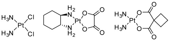 - Bernhardt, G.; Brunner, H.; Gruber, N.; Lottner, C.; Pushpan, S.K.; Tsuno, T.; Zabel, M. Carboplatin derivatives with superior antitumor activity compared to the parent compound. Inorg. Chim. Acta 2004, 357, 4452–4466. [Google Scholar] [CrossRef]