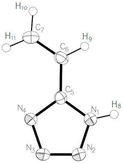 According to the calculation, the 1H-5-vinyltetrazole form has to be more stable in the gas phase with 0.5 kJ/mol more energy. The results of the X-ray diffraction show that a 4H- form of the molecule is prevalent in the crystal. This may be due to the presence of intramolecular cooperation: the occurring molecular energy of the 4H- form is greater than that of the 1H- form. However, it should be expected that there is a dynamic equilibrium between the two forms of the molecule’s existence in a crystalline phase. The rotation barrier of the vinyl fragment is 17.3 kJ/mol.
